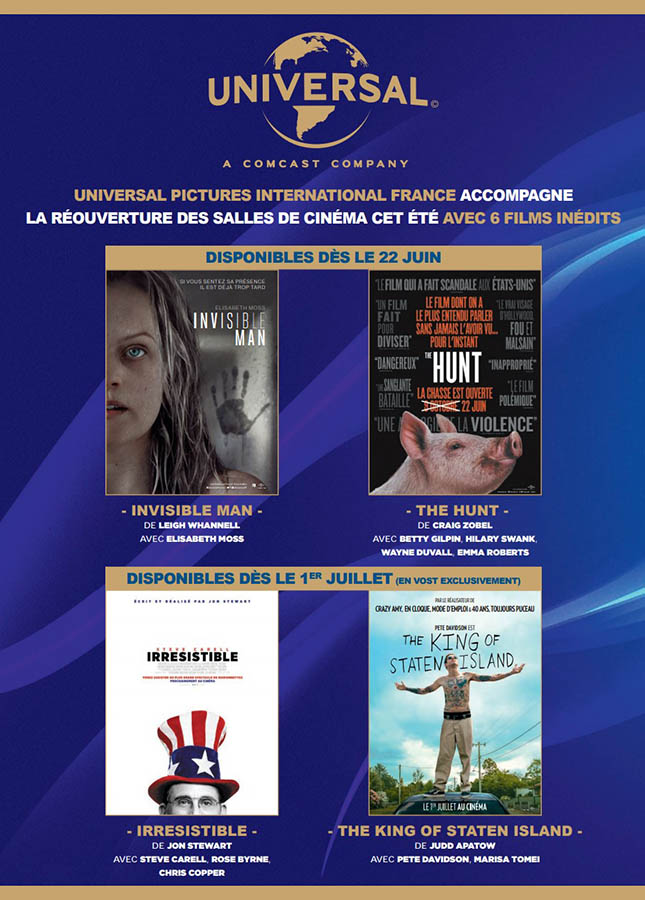Pour la réouverture des salles, Universal repropose Invisible Man, l’un des succès de la fin du mois de février qui a le plus de chance de ramener les spectateurs en salle. Malgré une sortie en VOD Premium, qui, au vu du prix, a été peu sollicitée, le distributeur annonce aussi la sortie de The Hunt, autre production Blumhouse. D’autres films mineurs issus de son répertoire récent seront mis à disposition des salles, alors que le distributeur n’en envisageait pas d’exploitation en salle : Irrésistible avec Steve Carell, The King of Staten Island de Judd Apatow, La voix du succès avec Dakota Johnson, et Never Rarely Sometimes Always. Pas vraiment de promo pour ces petites sorties, mais la volonté de permettre aux exploitants d’avoir quelques films américains à projeter, alors que le même distributeur a dû reculer la sortie des Minions d’un an ; Paramount a par ailleurs fait faux bond aux exploitants à la dernière minute en repoussant puis annulant la sortie très attendue du nouveau Bob l’éponge.