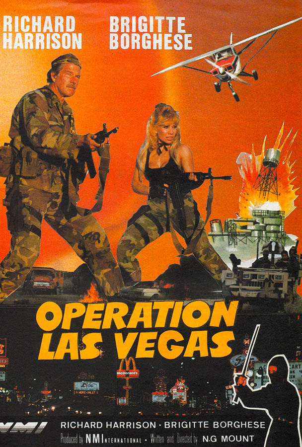 Alors que se rapproche la quarantaine, les choses se compliquent dans la vie de Brigitte Borghese dont la carrière professionnelle désormais se limitera à des rôles volontairement improbables chez Norbert Moutier, alias N.G. Mount. Le réalisateur de Mad Mutilator, fervent serviteur du cinéma bis, proche de Jean Rollin, et tenancier d’une librairie et vidéo-club culte dans IXe arrondissement de Paris, connu chez les aficionados de cinéma alternatif pour ses monster bis, l’emmène aux USA pour tourner le film d’action Opération Las Vegas. Dans la verve du cinéma d’Eurociné, avec encore moins de moyens, l’action movie à vocation internationale est un pur produit de l’ère VHS. A bout de souffle, on y retrouve l’acteur Richard Harrison qui venait de consacrer l’intégralité des années 80 aux projets les plus formidablement nuls (La guerre du pétrole pour Eurociné, Ninja Terminator, Hitman le cobra, Diamond Ninja Force…).