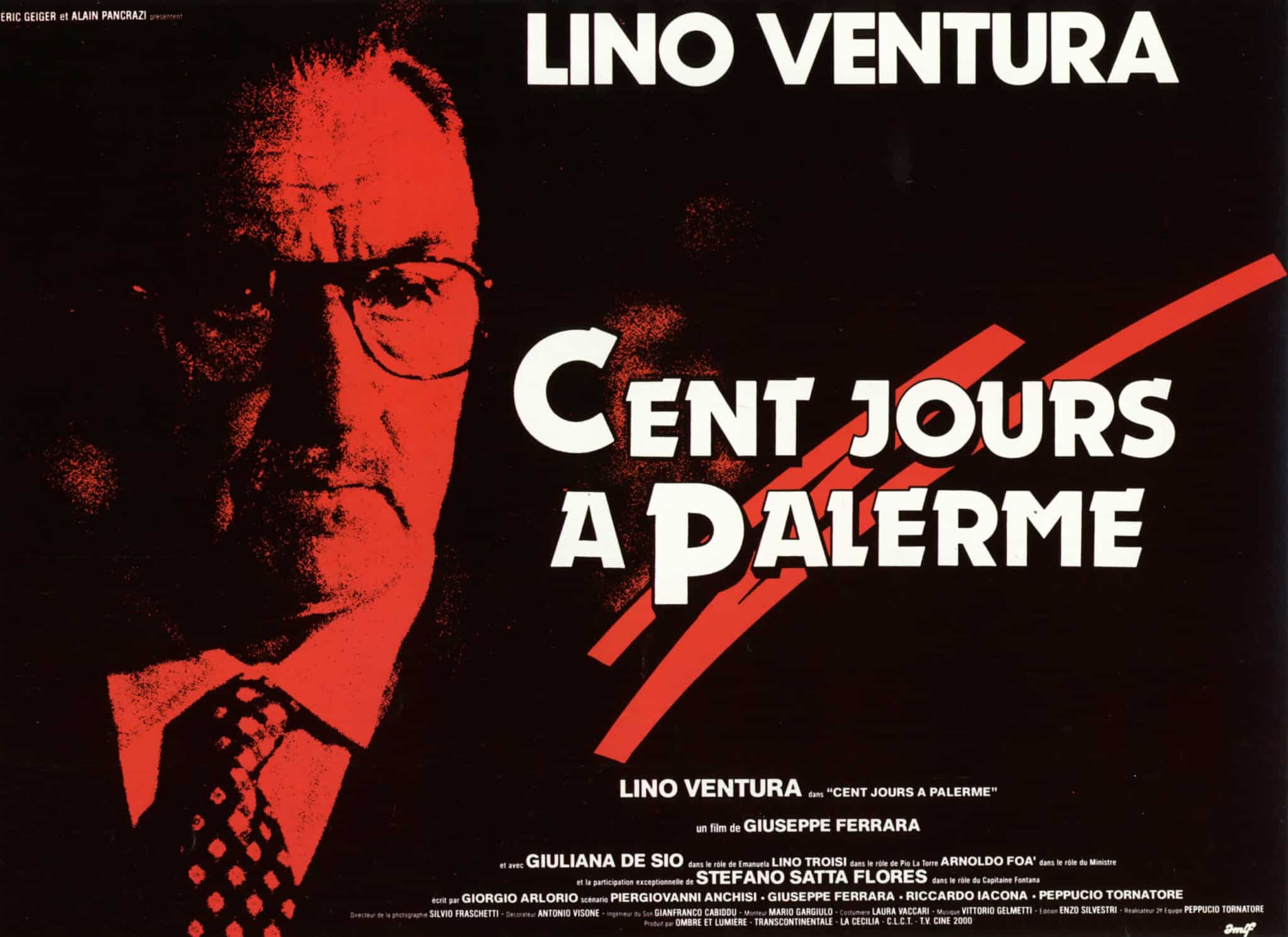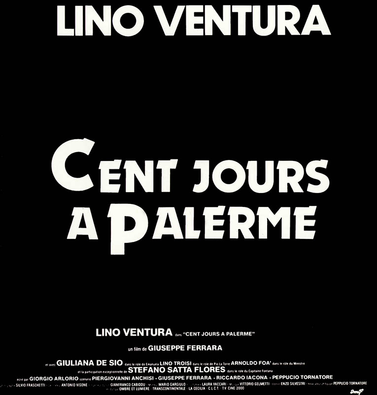 Cent jours à Palerme – © 1984 TF1 International – Transcontinentale Productions – Pacifique Productions – Compania Lavoratori del Cinema e del Teatro (C.L.C.T.) – TV Cine 2000 / Affiche : A.R.P./ L.P.C. (agence). Tous droits réservés.