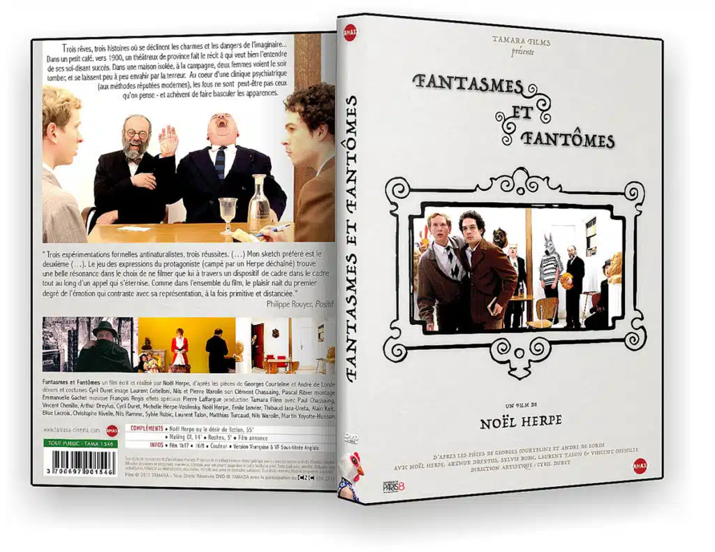 Voici donc qu’il franchit le cap du long (en fait un collage, en quelque sorte), là où ne l’attendaient que ceux qui savent son goût pour le théâtre, avec l’adaptation de trois pièces à la fois courtes et relativement obscures signées de Courteline (la première) et André de Lorde (les deux suivantes), ce dernier étant autrefois réputé pour ses pièces de Grand-Guignol.