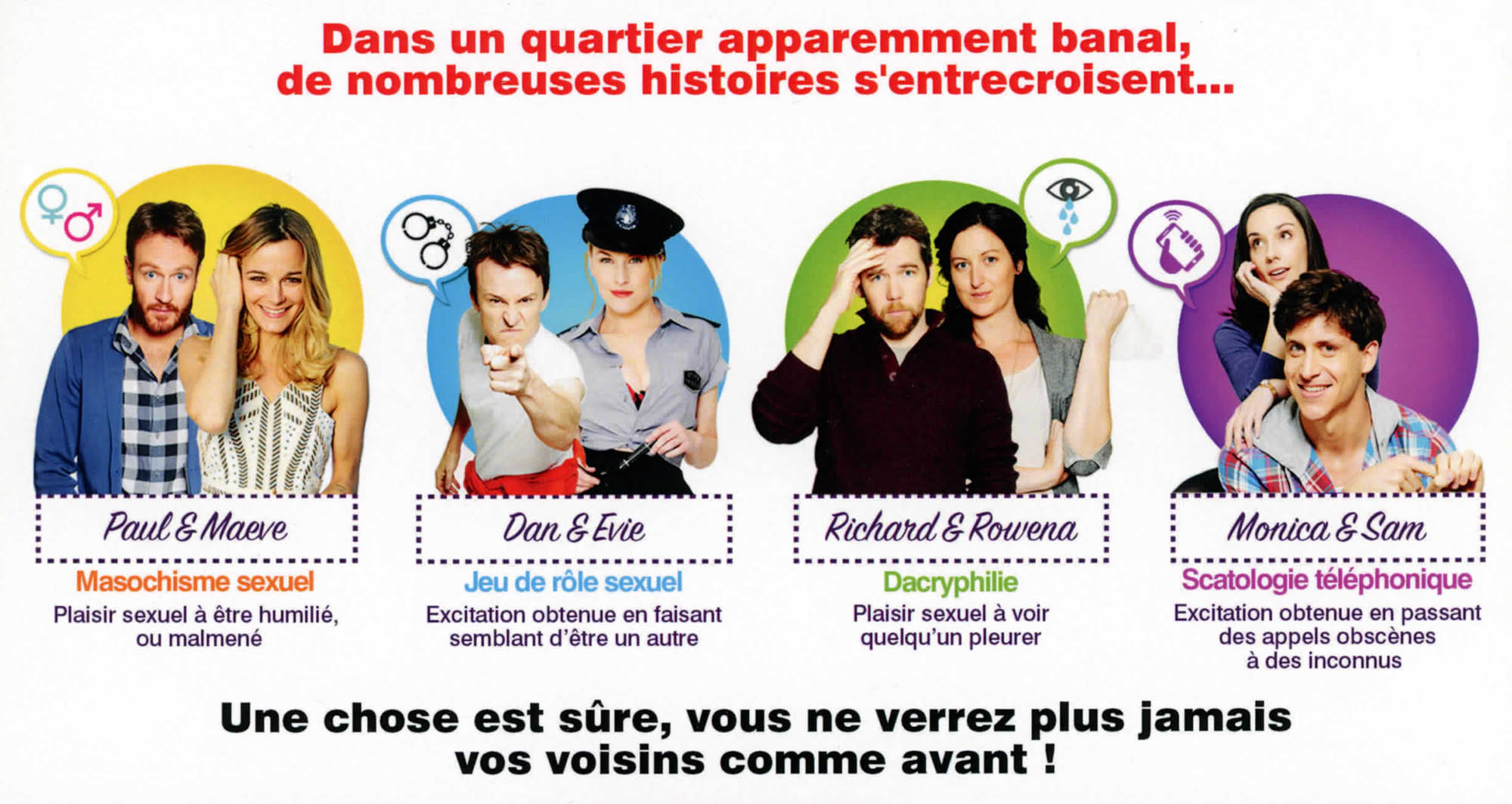 Synopsis : Dans un quartier apparemment banal, de nombreuses histoires s’entrecroisent. Une femme qui voudrait exaucer des fantasmes particulièrement osés et son compagnon qui lutte pour les assouvir. Un homme qui débute une liaison secrète avec sa propre femme, sans que celle-ci ne se doute de la véritable identité de son amant. Un couple qui tente de se reconstruire après une expérience sexuelle qui a dérapé. Une femme qui n’éprouve du plaisir que dans la souffrance de son époux. Une téléopératrice prise au milieu d’un appel sulfureux et chaotique. Et le nouveau voisin, incroyablement charmant, qui se retrouve au centre de toutes les attentions.