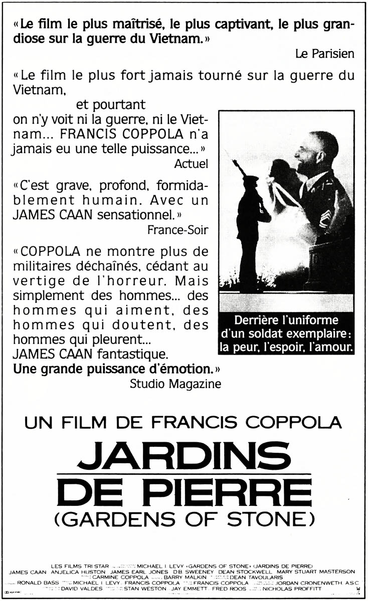 Pour Columbia TriStar, Coppola tourne le pendant intime d’Apocalypse Now, Jardins de pierre. Ce n’est pas son scénario, mais le matériau littéraire de départ, premier roman signé Nicholas Proffitt, ancien grand reporter pour Newsweek, qui l’emballe.