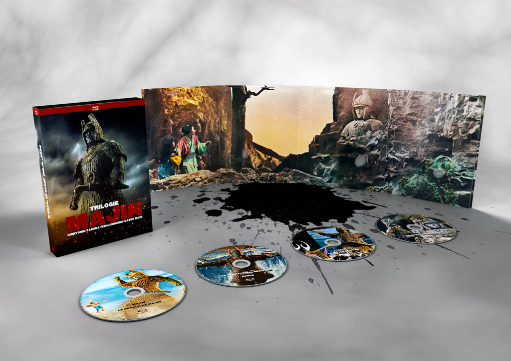 Très épais coffret digipack, avec quatre disques, reprenant notamment sur trois des pans de la box les affiches japonaises originales. Collector, même si les visuels ne sont pas forcément des plus beaux. Le coffret comprend deux DVD et deux blu-ray, pour éviter de charger la charrue et ainsi se libérer de toute compression excessive. La trilogie Majin est proposée en édition limitée, avec seulement 1 000 exemplaires et pas un de plus mis en circulation. Vu la vitesse à laquelle les titres du Chat s’épuisent (Perversion Story, Le couteau de glace…), il ne faudra pas tergiverser trop longtemps. Le test a été effectué sur le coffret définitif, mis à disposition par l’éditeur.