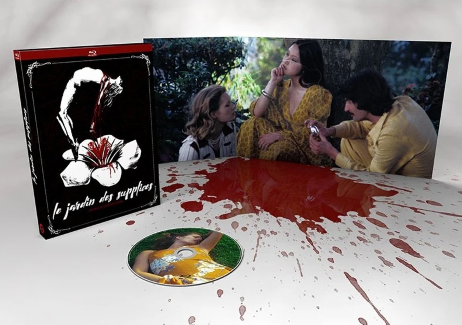 Après une petite carrière en salle chez Parafrance, Le Jardin des supplices a beaucoup voyagé, semant ses mauvaises graines partout en Europe, y compris aux USA. Sa carrière en VHS, n’a pas laissé de racine, et il aura fallu Canal + pour permettre de redécouvrir cet électron libre dans une copie exécrable. Reste que peu de temps après le vilain Chat de l’édition blu-ray français l’a extirpé en blu-ray, pour une version intégrale, qui revient de loin dans le master. On redécouvre l’œuvre, à nouveau, on s’intéresse à nouveau à Gion que l’on aime voir aujourd’hui sous un angle plus hétéroclite. Un petit regret, le choix d’une jaquette 2020 qui ne reprend pas ce qu’il y a de plus beau dans ce Jardin des supplices, l’affiche surréaliste du peintre polonais Wojtek Siudmak, qui signa des affiches pour le Festival du Film Fantastique de Paris et qui œuvra même pour Cannes. Pour Le jardin des supplices, l’artiste libéra de son imaginaire sans frontière un pur bijou ésotérique que l’on vous laisse contempler ci-dessous. Evidemment, ce visuel transcende l’œuvre qui, elle, est bien loin de se parer d’une telle créativité. Néanmoins, passer à côté, serait nier les curiosités longtemps perdues des années 70, qui nous aident à mieux appréhender les frictions du microcosme cinématographique, mais aussi celles de notre société.